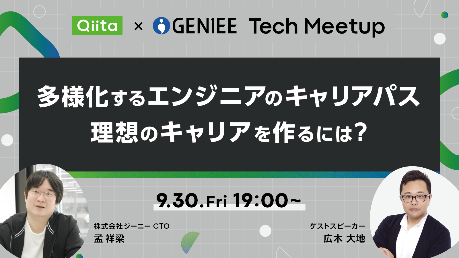 株式会社ジーニー(本社:東京都新宿区、代表取締役社長:工藤智昭、以下ジーニー)は、日本最大級のエンジニアコミュニティ「Qiita(キータ)」を展開しているQiita株式会社(本社:名古屋市中村区、代表取締役社長:柴田健介、以下Qiita)と共同で、2022年9月30日(金)にエンジニア向けのオンラインイベント「Qiita × GENIEE Tech Meetup  ~多様化するエンジニアのキャリアパス。理想のキャリアを作るには?~」を開催いたします。