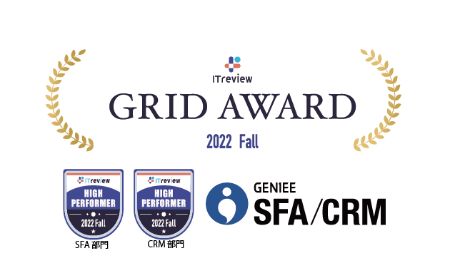 今回は、当社の営業管理ツール「GENIEE SFA/CRM」がITreview Grid Award 2022 Fallにおいて顧客満足度の優れた製品に贈られる「High Performer」をSFA部門、CRM部門の2部門にて受賞することができました。2018年10月~2022年9月までに掲載された9.8万件のレビューをもとに選ばれ、使いやすさや費用対効果の高さに対する好評価のコメントが多く寄せられました。