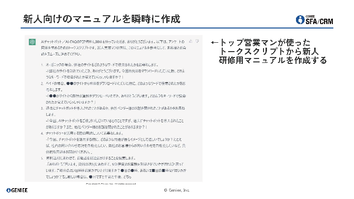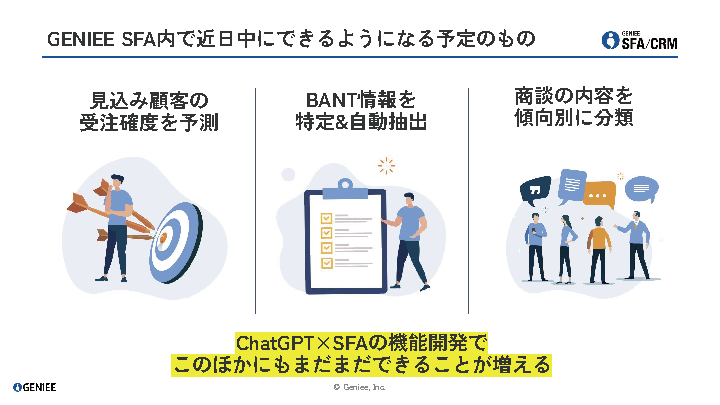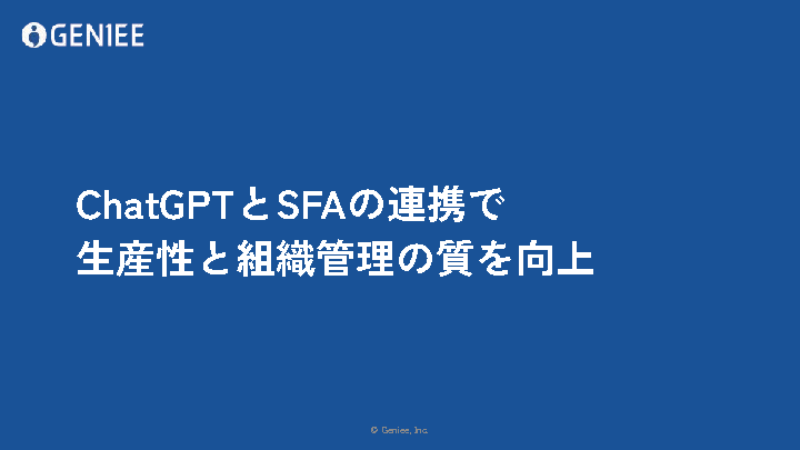 営業管理ツール「GENIEE SFA/CRM」を提供する株式会社ジーニー(本社:東京都新宿区、代表取締役社長:工藤 智昭、以下ジーニー)は、4月26日(水)にChatGPTとSFA/CRMの機能連携を含めた営業活動や組織マネジメントにおけるAI技術の活用をテーマにしたセミナーを無料で開催します。