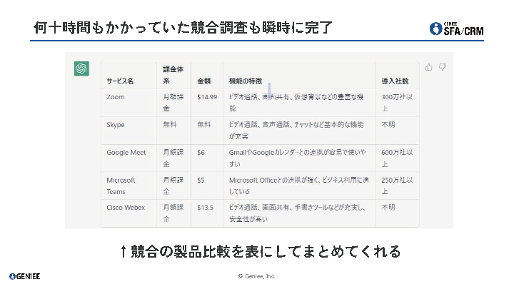 ChatGPTがリリースされたばかりの2022年11月には、「精度が悪い」「現場ではまだまだ使えない」などの声も聞かれましたが、頻繁に繰り返されたアップデートにより、リリース当初に比べ性能が飛躍的に向上しています。今回のセミナーでは、自社開発のSFA/CRMを提供している株式会社ジーニーが累計10,000社以上のIT導入支援の実績から、営業やマーケティングの現場が抱える課題の解決についてお伝えします。