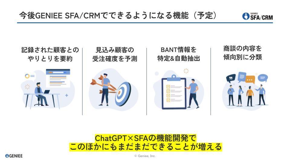 株式会社ジーニー(本社:東京都新宿区、代表取締役社長:工藤 智昭、以下ジーニー)は、自社開発の営業管理ツール「GENIEE SFA/CRM」において、ChatGPTの活用による大幅な利便性向上のための機能開発に取り組んでいます。その第1弾として、SFA/CRM内に登録された議事録等のテキストデータをChatGPTで自動要約する機能をリリースしました。今後も「GENIEE SFA/CRM」に、ノーコードで企業の業務効率化につなげられるAIを活用した機能を随時リリースしていく予定です。