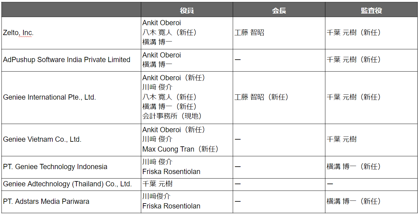 株式会社ジーニー(本社:東京都新宿区、代表取締役社長:工藤 智昭、以下ジーニー)は本日付けで保有する海外子会社の役員体制を変更を行いましたのでお知らせします。