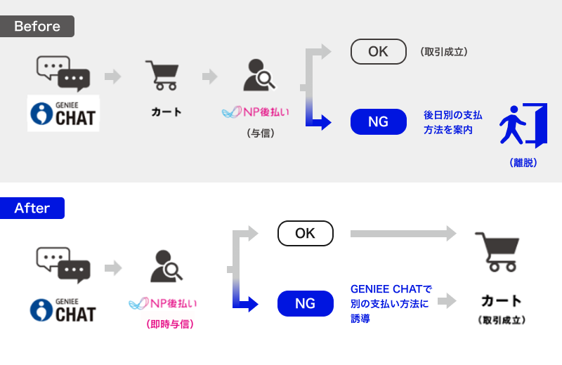 従来は「GENIEE CHAT」からカートに遷移して注文が完了し、その後に「NP後払い」の与信を実施していたため、与信NG(与信不通過)になった場合に購入者の離脱が発生していました。