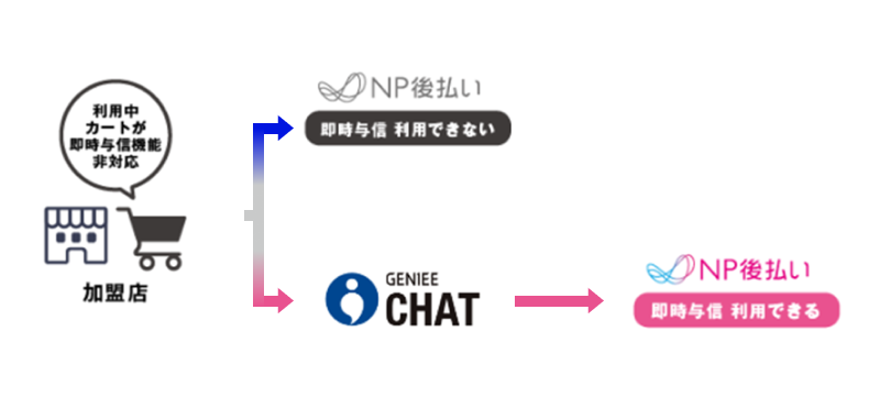 「NP後払い」の即時与信機能が未実装のカートを利用していても、「GENIEE CHAT」を利用することで「NP後払い」の即時与信機能の利用が可能になります。