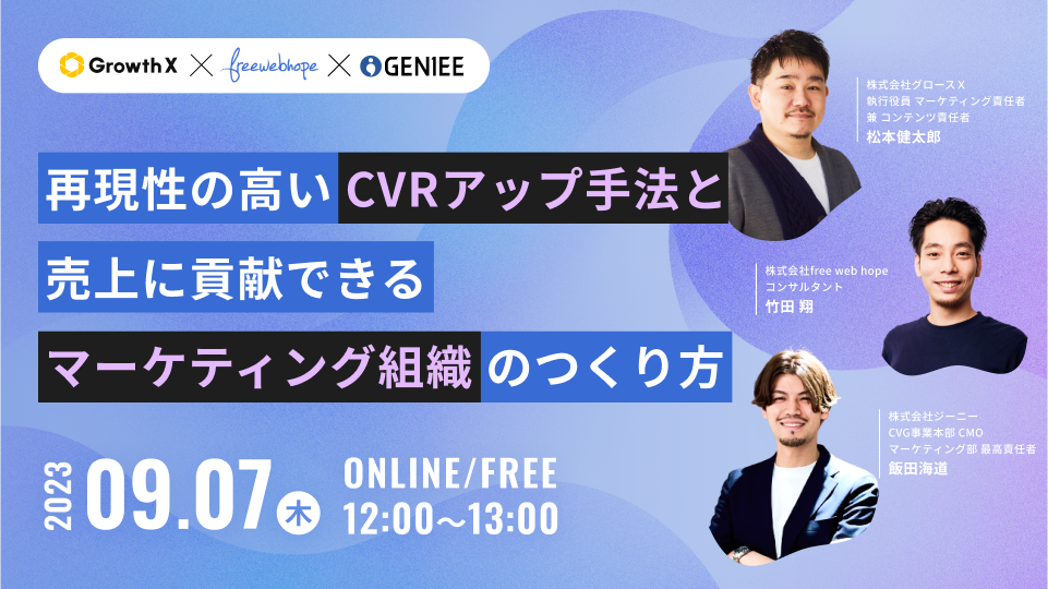 9月7日(木)に、株式会社ジーニーCVG事業本部は、株式会社free web hope、株式会社グロースXの3社共催の無料オンラインセミナー「再現性の高いCVRアップ手法と売上に貢献できるマーケティング組織のつくり方」を開催します。
