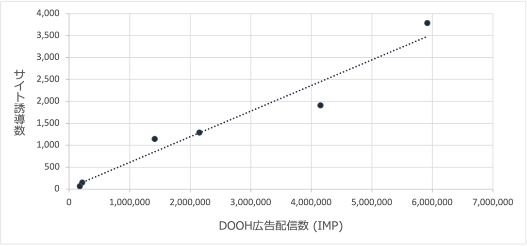 下記のグラフはエリアごとのDOOH広告の広告配信数とサイト誘導の関係をプロットしたものである。これを見ると、明らかな正の相関が見て取れる。DOOH広告にはサイト誘導効果があることが確認できた。