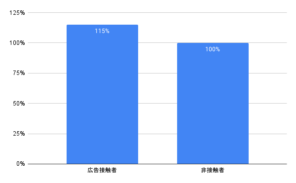 主目的であるブランド認知効果については、以下の結果が得られた。ブランド認知度を比較すると、DOOH広告の接触者は非接触者に比べ、当該新築マンションブランドを「とても知っている」「やや知っている」と回答した割合が15%高く、ブランド認知効果が高まることが確認できた。(非接触者の認知度を100%とした際のブランドリフト調査を実施)