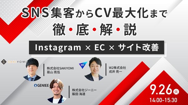 9月26日(火)に、株式会社ジーニー CVG事業本部は、株式会社SAKIYOMI、W2株式会社の3社共催の無料オンラインセミナー「Instagram×EC×サイト改善 SNS集客からCV最大化まで徹底解説」を開催します。