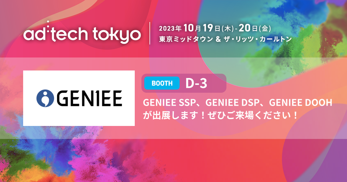 株式会社ジーニーサプライサイド事業本部、デマンドサイド事業本部は、2023年10月19日(木)、20日(金)に開催される展示会「ad:tech tokyo 2023」(主催:Comexposium Japan株式会社)に出展します。