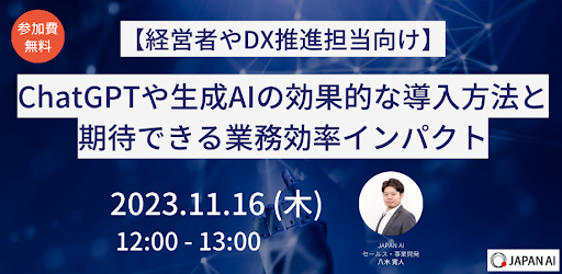 11/16(木)にジーニーの子会社JAPAN AI株式会社は無料オンラインセミナー「【経営者やDX推進担当向け】ChatGPTや生成AIの効果的な導入方法と期待できる業務効率インパクト」を開催します。