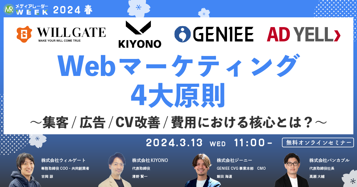 株式会社ジーニー GENIEE CVG事業本部は、2024年3月11日(月)~3月15日(金)に開催されるオンラインセミナーイベント「第13回メディアレーダーWEEK 2024 春」(主催:メディアレーダー運営事務局)において「Webマーケティング4大原則 ~集客/広告/CV改善/費用における核心とは?~」に登壇します。