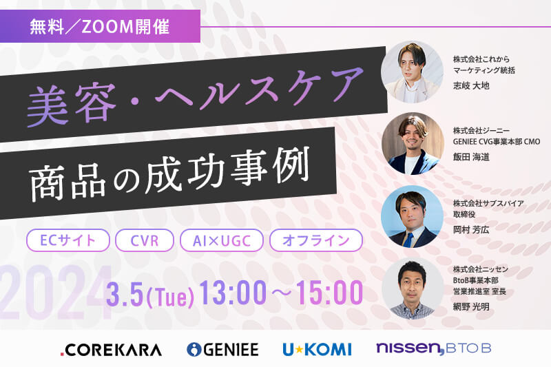 2024年3月5日(火)に、株式会社ジーニー GENIEE CVG事業本部は株式会社これから、株式会社サブスパイア、株式会社ニッセンの4社共催の無料オンラインセミナー「\即効性のある施策を厳選/美容・ヘルスケア商品の成功事例 紹介ウェビナー」を開催します。