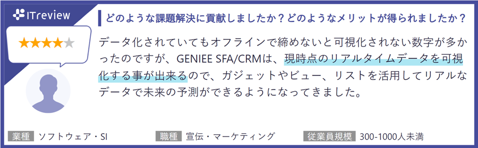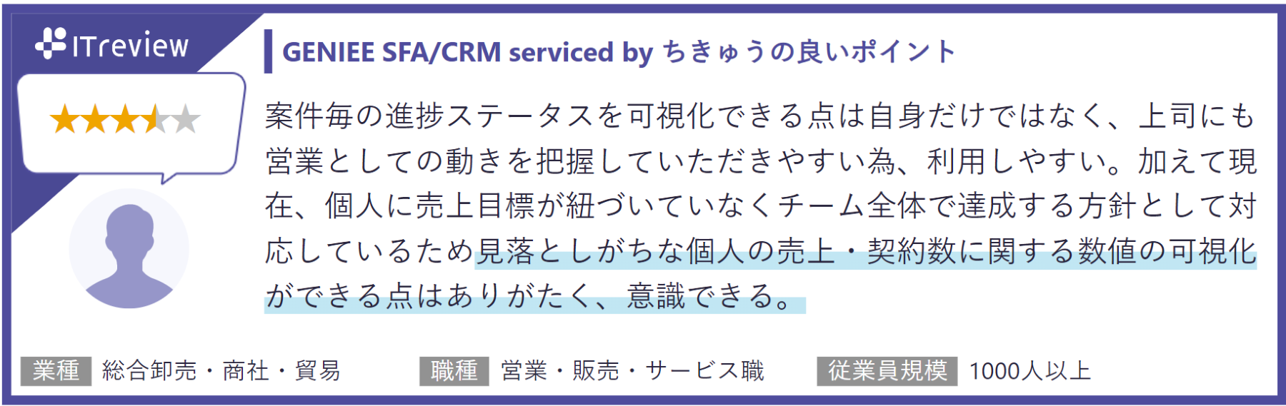 今回の「ITreview Grid Award 2024 Spring」は2024年3月までに掲載されたレビューの集計結果をもとに選定されています。「GENIEE SFA/CRM」を活用した営業進捗の可視化による社内での情報共有や会議の質改善に関する高評価のコメントが多く寄せられました。