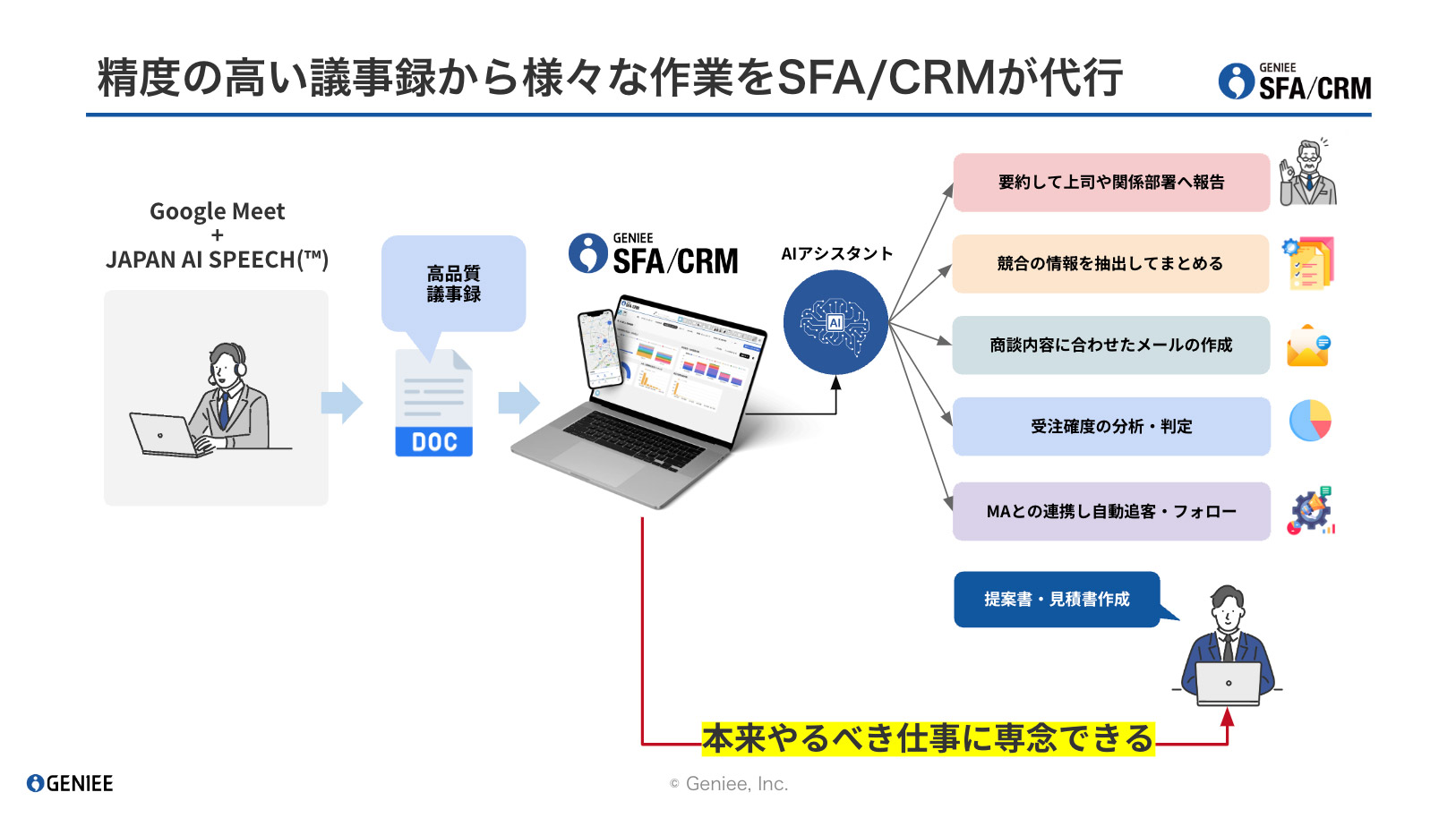 株式会社ジーニー(本社:東京都新宿区、代表取締役社長:工藤 智昭、以下ジーニー)が提供する営業管理ツール「GENIEE SFA/CRM」は、子会社であるJAPAN AI株式会社(本社:東京都新宿区、代表取締役社長:工藤 智昭、以下JAPAN AI)が提供するAI議事録作成システム「JAPAN AI SPEECH(™)」を連携させることで、Google Meetを使ったオンライン会議の議事録を自動作成し、営業担当者の作業負担を大幅に軽減する新機能を実現しました。