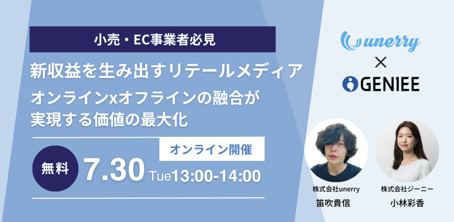 7月30日(火)に、株式会社ジーニーマーケティングクラウド統括本部は、株式会社unerry(以下、unerry)と2社共催の無料オンラインセミナー「新収益を生み出すリテールメディア オンラインxオフラインの融合が実現する価値の最大化」を開催します。