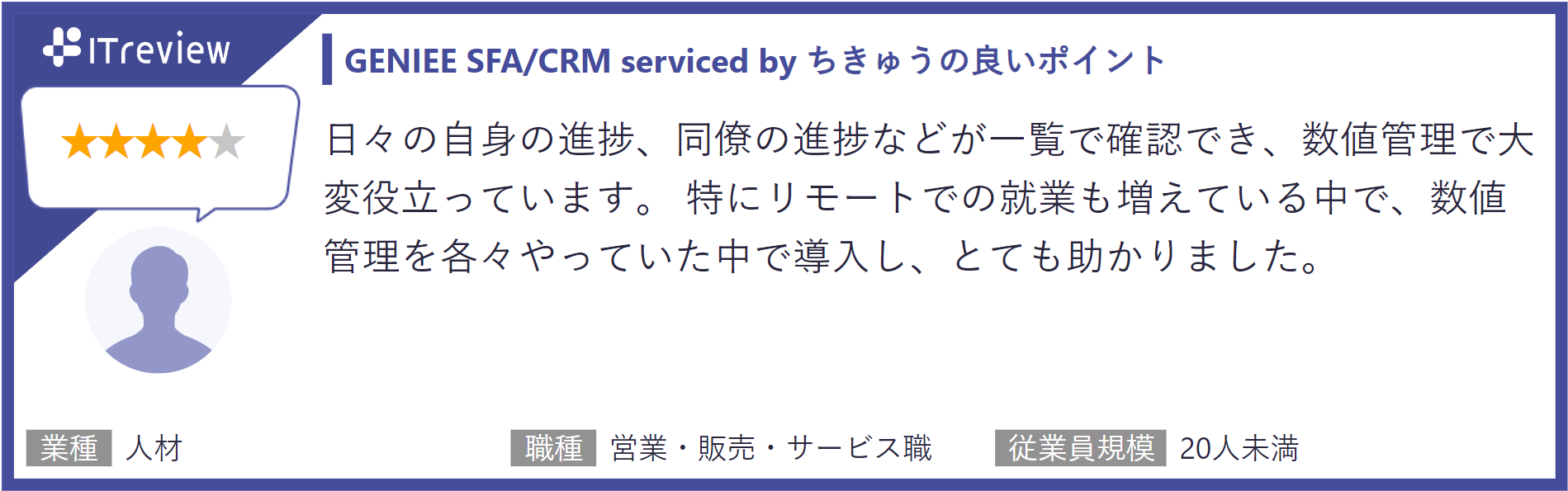 今回の「ITreview Grid Award 2024 Summer」は2024年6月までに掲載されたレビューの集計結果をもとに選定されています。「GENIEE SFA/CRM」を活用した営業進捗の可視化による社内での情報共有や会議の質改善に関する高評価のコメントが多く寄せられました。