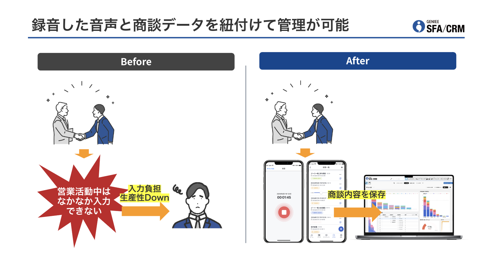 これまで、負担がかかっていた商談内容・作業記録の入力作業は、特に外回り営業や対面でのオフラインの場で活用が期待できます。ボタンをONするだけで商談終了後には「GENIEE SFA/CRM」に情報が紐付いた状態で登録されます。これにより、入力負担を大幅に軽減することが可能です。