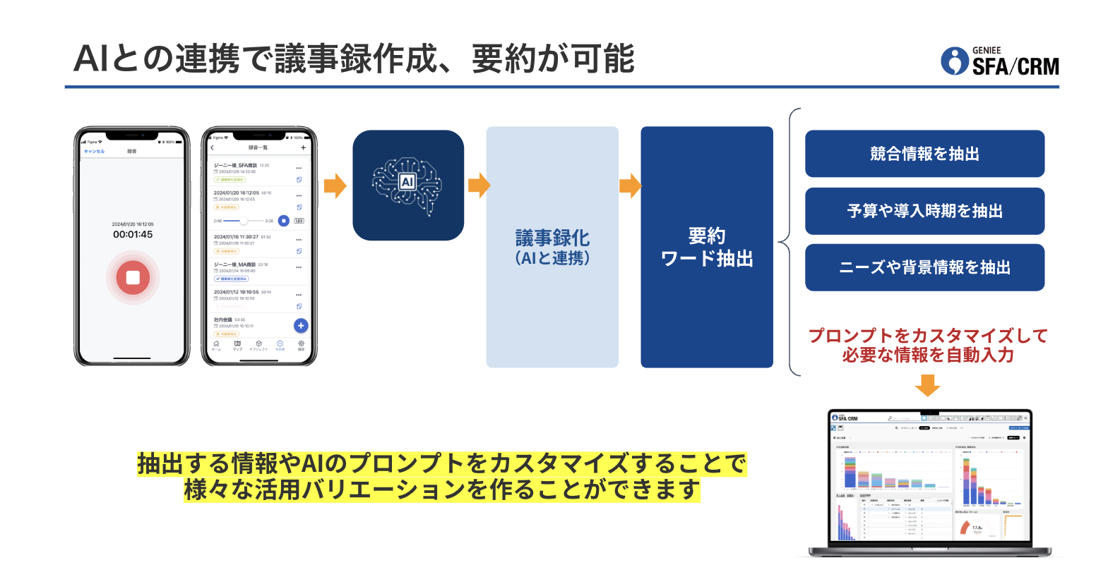 録音された商談の音声とAIを活用することで、音声データの文字起こしや要約、さらに、「GENIEE SFA/CRM」に設定された各項目へ入力すべき情報を抽出し、自動で入力することができます。