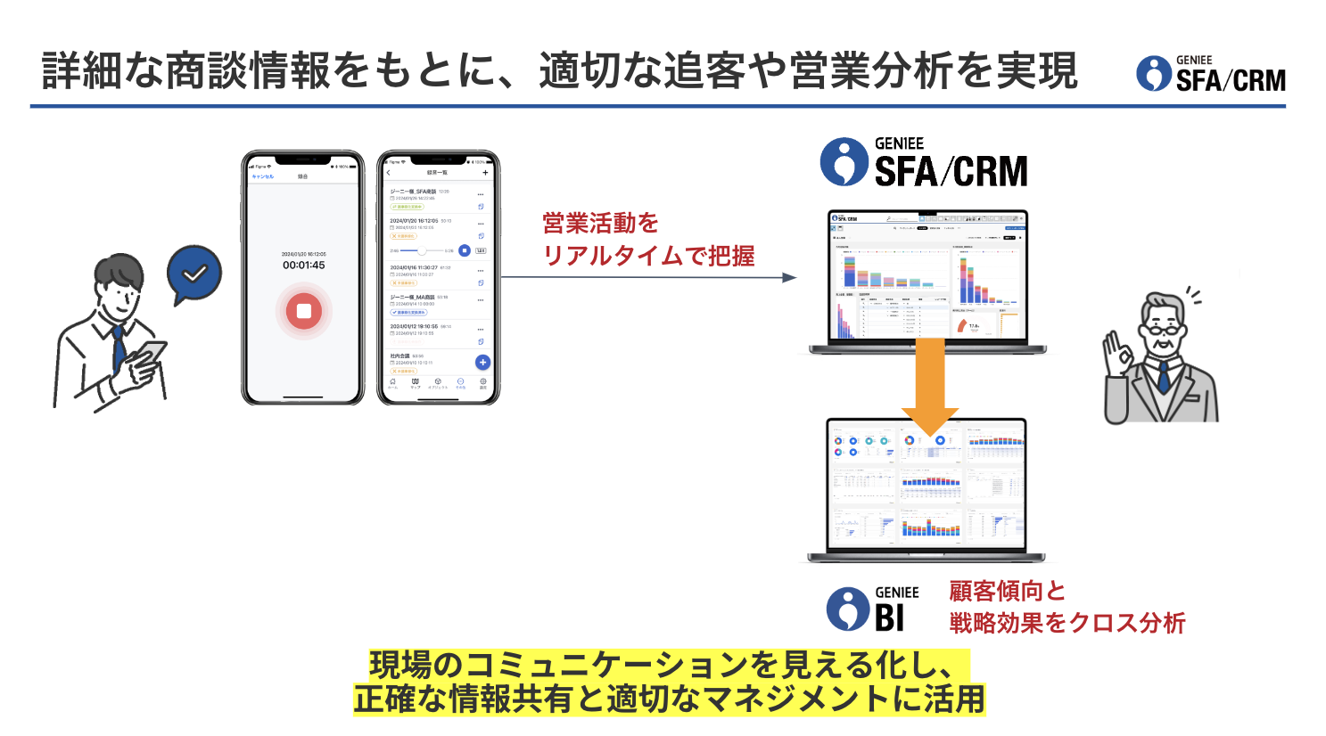 対面での商談内容の録音をAIで要約し、「GENIEE SFA/CRM」へ紐付けを行います。