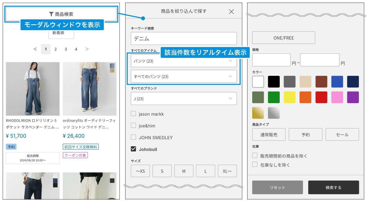 「プレモーダルフィルタリング」機能を活用することで、検索結果から詳細ページへの遷移率が約10%向上したという実績があります。この機能では、検索結果ページに遷移する前に価格帯やブランド、カラー、サイズなどのさまざまな詳細項目を複数の軸で絞り込み、検索を行うことができます。これによりスムーズな購買体験を提供し、ユーザーの満足度やコンバージョン率の向上が期待できます。