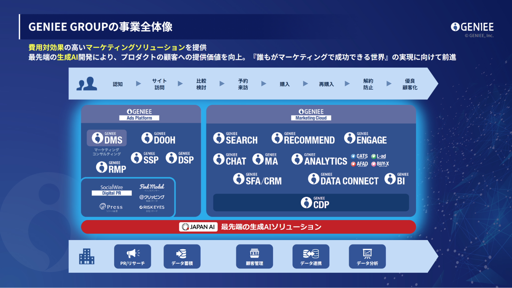 ジーニーは、「誰もがマーケティングで成功できる世界を創る」、「日本発の世界的なテクノロジー企業となり、日本とアジアに貢献する」という2つのPurpose(企業の存在意義)のもと、企業の収益拡大・生産性向上など様々な課題解決につながるソリューションを開発・提供するマーケティングテクノロジーカンパニーです。