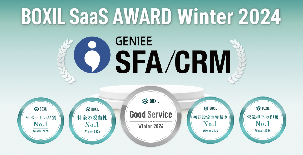 株式会社ジーニー(本社:東京都新宿区、代表取締役社長:工藤 智昭、以下ジーニー)が開発・提供する営業管理ツール「GENIEE SFA/CRM」が、スマートキャンプ株式会社(以下、スマートキャンプ)が開催する「BOXIL SaaS AWARD Winter 2024」のSFA(営業支援システム)部門で4期連続「Good Service」を受賞しました。、また「サポートの品質No.1」「料金の妥当性No.1」「初期設定の容易さNo.1」など、これまでに受賞実績があるNo.1の称号に加え、今回新たに「営業担当の印象No.1」を受賞しました。