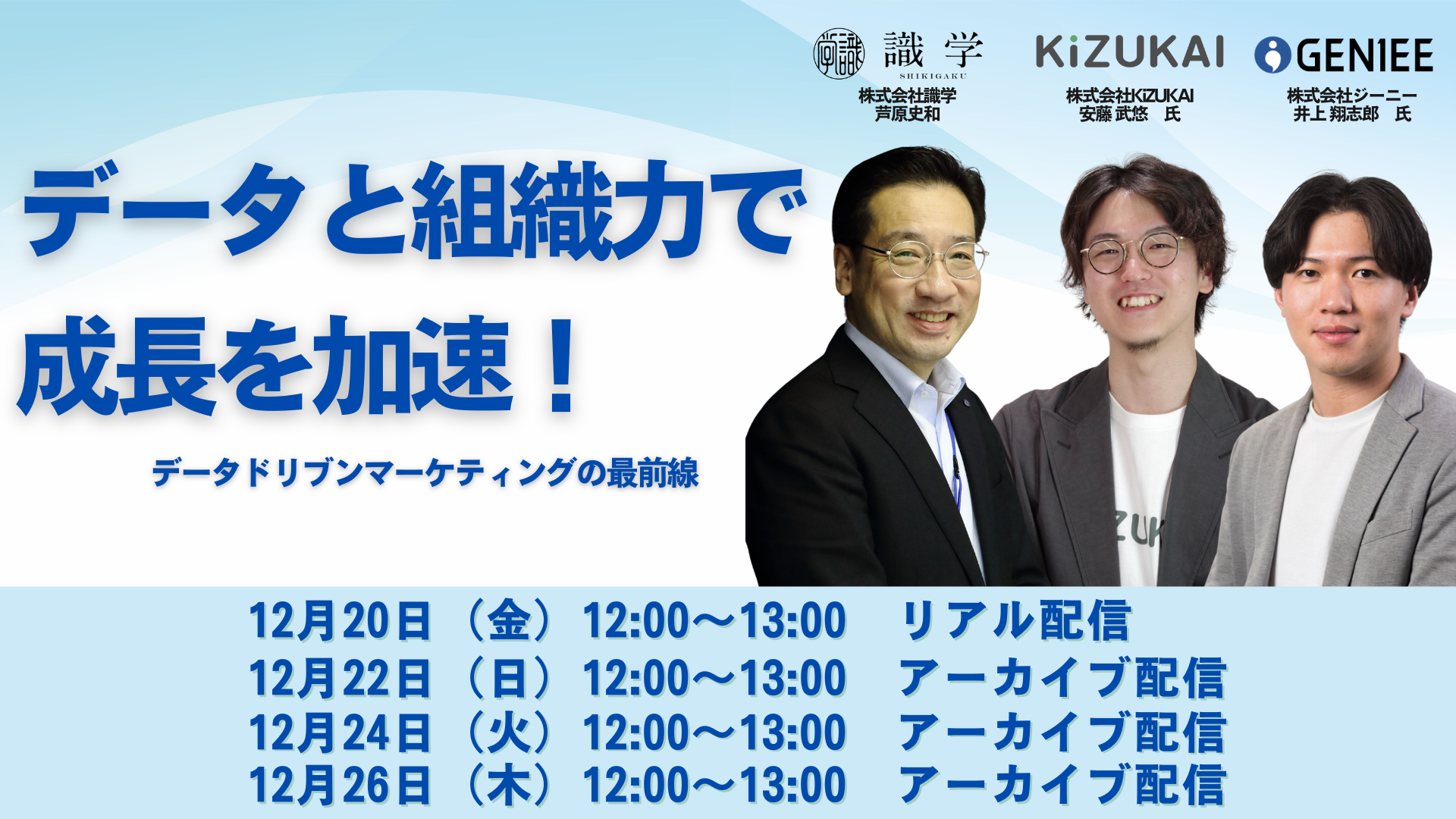株式会社ジーニー マーケティングクラウド統括本部は、2024年12月20日(金)に、株式会社識学、株式会社KiZUKAIと共催の無料オンラインセミナー「データと組織力で成長を加速!データドリブンマーケティングの最前線」に登壇します。