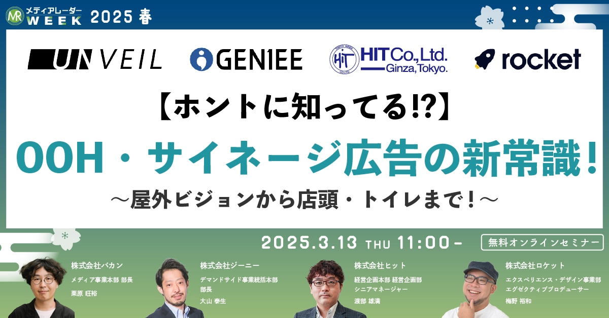 株式会社ジーニー デマンドサイド事業統括本部は、2025年3月10日(月)〜3月14日(金)に開催される「第17回メディアレーダーWEEK 2025春」において、OOH(屋外広告)・サイネージ広告に関するテーマで登壇します。