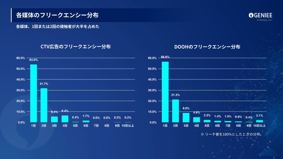 この状況を踏まえ、ジーニーはオンライン・オフライン統合ソリューションのテストとして、DOOHとCTV広告を組み合わせた広告配信を行い、両媒体を横断したリーチの変化などを計測しました。