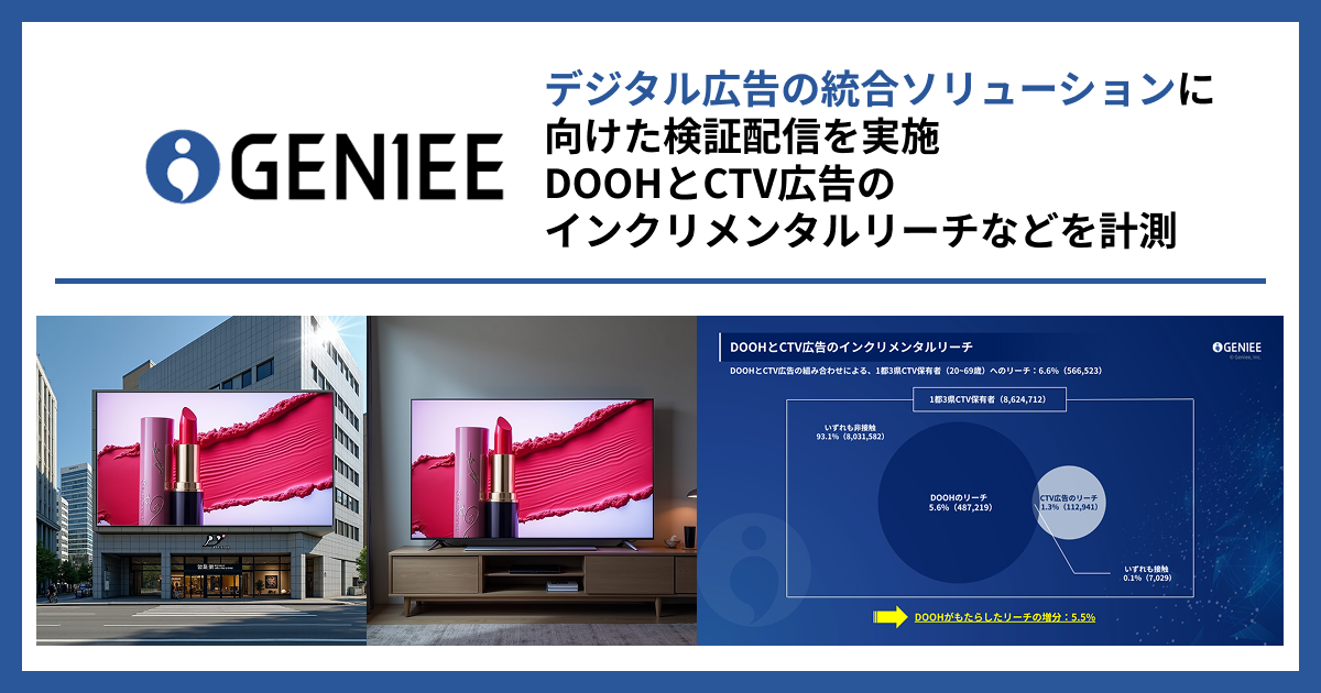 株式会社ジーニー(本社:東京都新宿区、代表取締役社長:工藤 智昭、以下ジーニー)は、デジタル広告の統合ソリューション提供に向け、DOOHとコネクテッドTV(以下CTV)広告の一括配信と統合モニタリングの検証を実施しました。