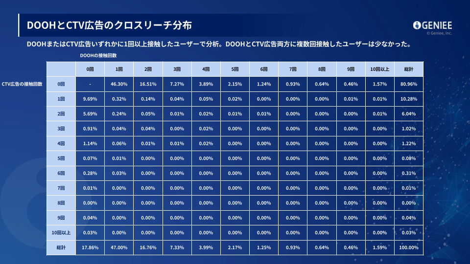 DOOHまたはCTV広告のいずれかに1回以上接触したユーザーを分析。DOOHとCTV広告両方に複数回接触したユーザーは少なかった。