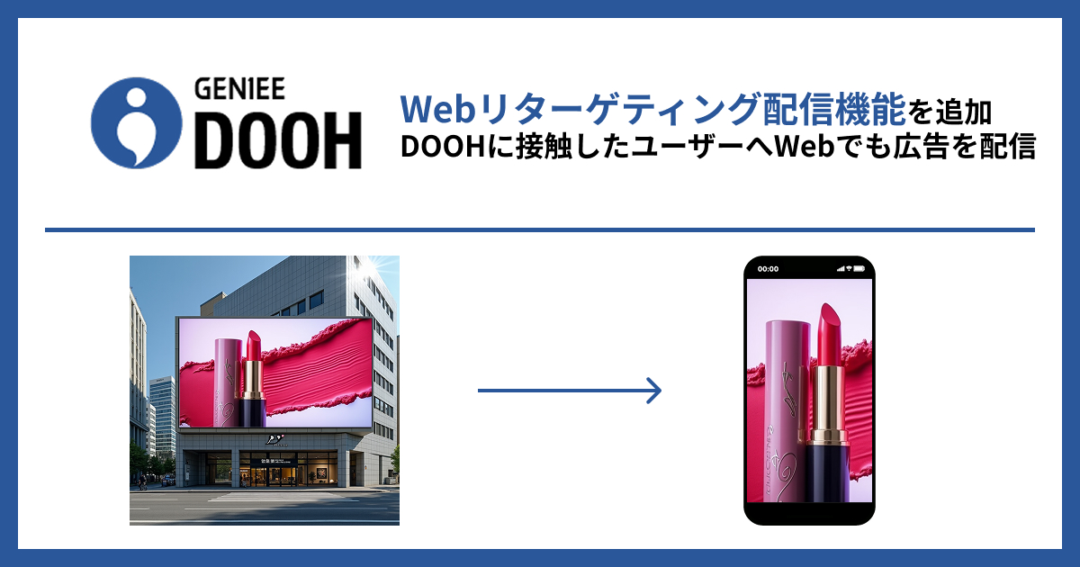 株式会社ジーニー(本社:東京都新宿区、代表取締役社長:工藤 智昭、以下ジーニー)は、デジタル屋外広告プラットフォーム「GENIEE DOOH」において、DOOHに接触したユーザーに対してWeb上でリターゲティング配信を可能にする機能を追加したことをお知らせします。