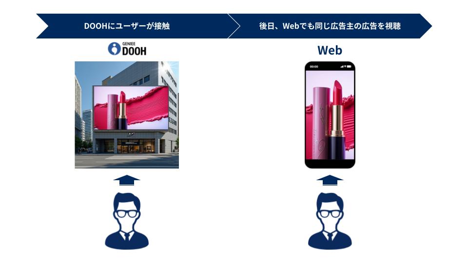 例えば、街でDOOHに接触したユーザーが、後日、別の場所にいても同じ広告主様のWeb広告を視聴できるので、再接触する機会を増やすことができます。