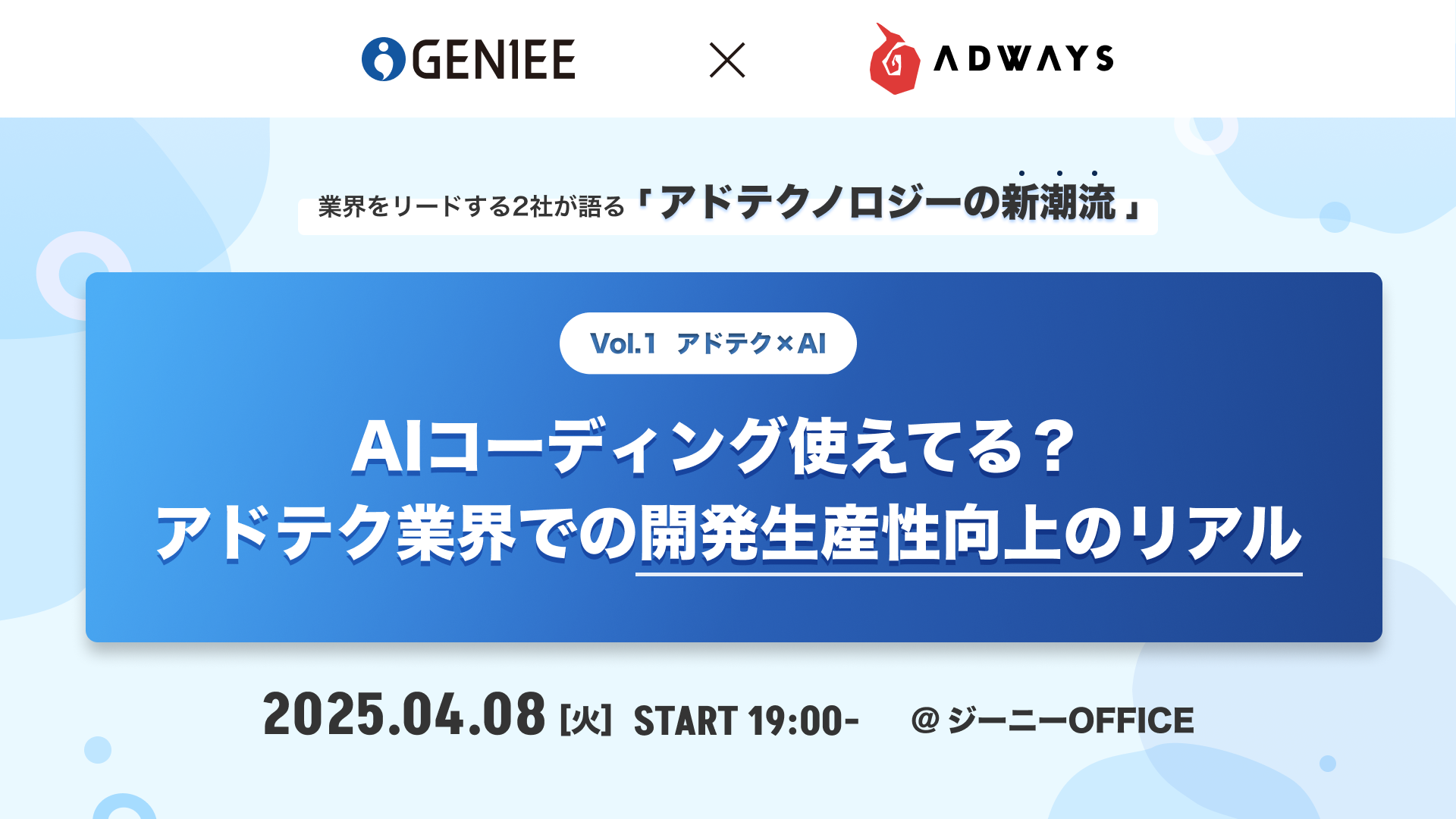 株式会社ジーニー(本社:東京都新宿区、代表取締役社長:工藤智昭、以下ジーニー)は、株式会社ADWAYS DEEEと共催で2025年4月8日(火)にエンジニアを対象としたオフライン勉強会「業界をリードする2社が語るアドテクノロジーの新潮流/Vol.1【アドテク×AI】AIコーディング使えてる?アドテク業界での開発生産性向上のリアル」を開催します。