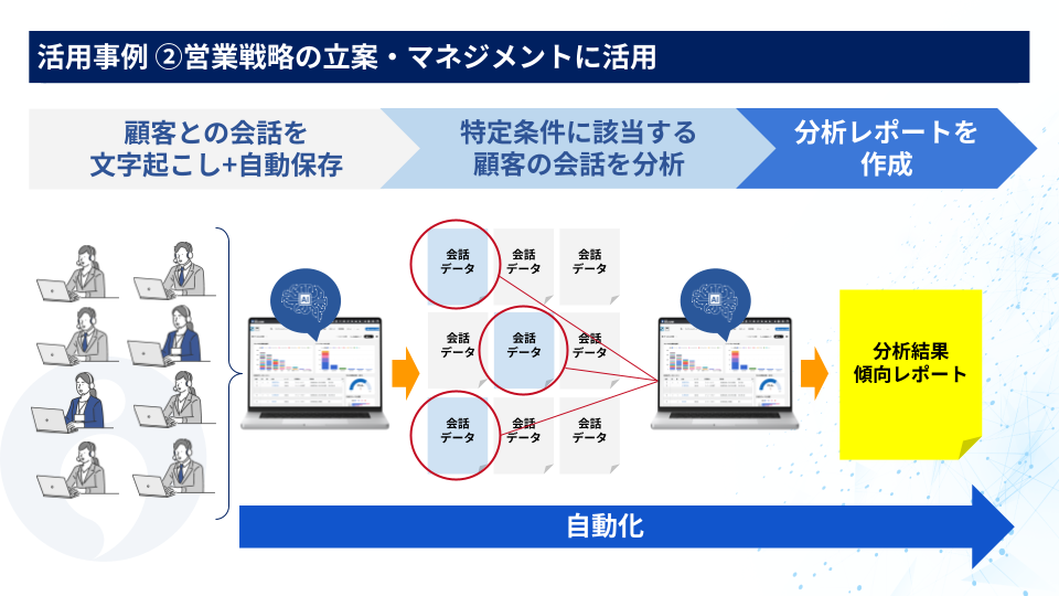 膨大な会話データの中から、特定セグメントに該当する情報を抽出、分析し、ニーズ傾向やプロセスの傾向を分析レポートとして自動生成します。これにより営業戦略の立案と改善スピードを高速化し、深い顧客理解とパーソナライズされたアプローチの実現を支援します。