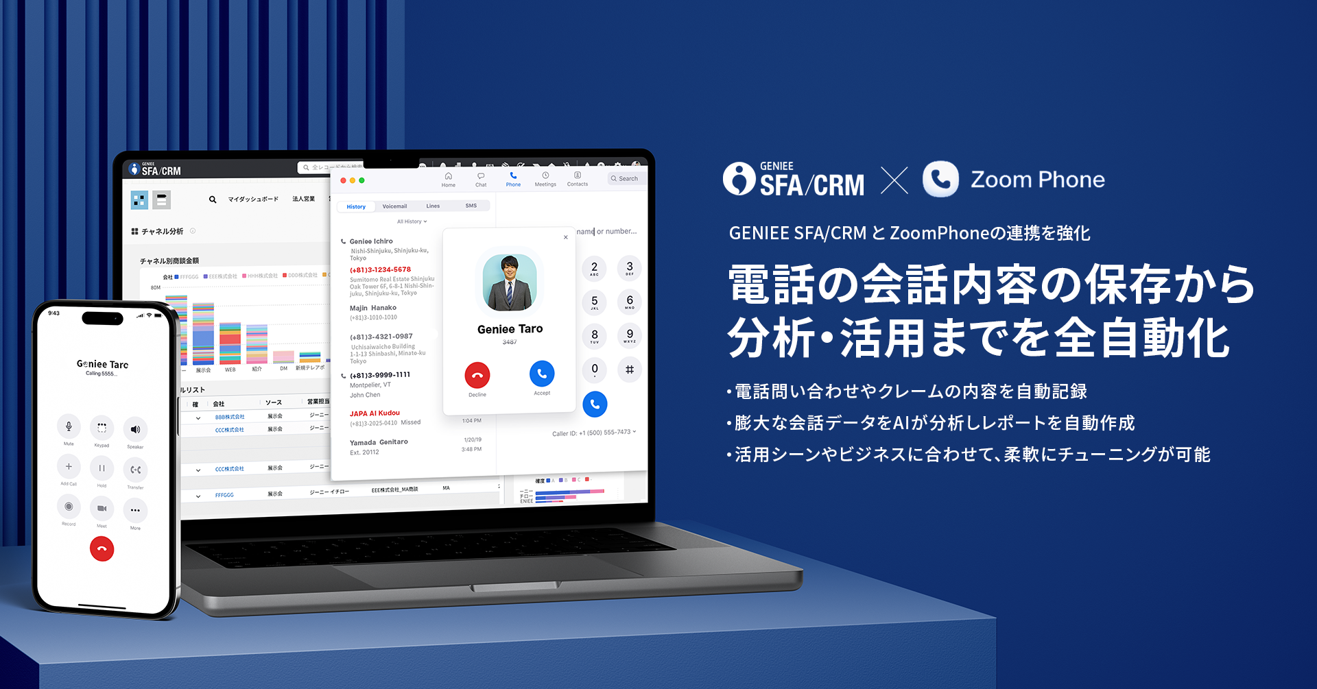 株式会社ジーニー(本社:東京都新宿区、代表取締役社長:工藤 智昭、以下ジーニー)が提供する営業管理ツール「GENIEE SFA/CRM」は、ビデオ会議ツールZoom Meetingsで広く知られる Zoom Communications Inc.が提供している、クラウドPBXサービス(※)『Zoom Phone』との連携を実現しました。これにより、顧客との会話データの保存・管理から分析までを一気通貫で自動化できるようになりました。
