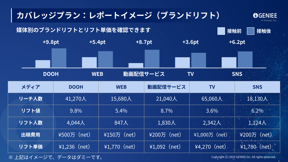 媒体ごとのリーチ率やリーチ単価に加え、ブランドリフトサーベイによって媒体ごとの態度変容効果を可視化