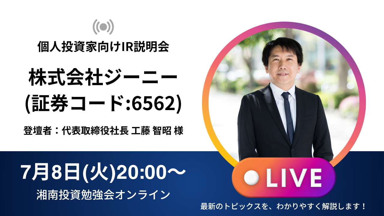 株式会社ジーニー(以下ジーニー)は、2025年7月8日(火) にオンラインで開催される個人投資家向けIR説明会(主催:湘南投資勉強会)に登壇します。