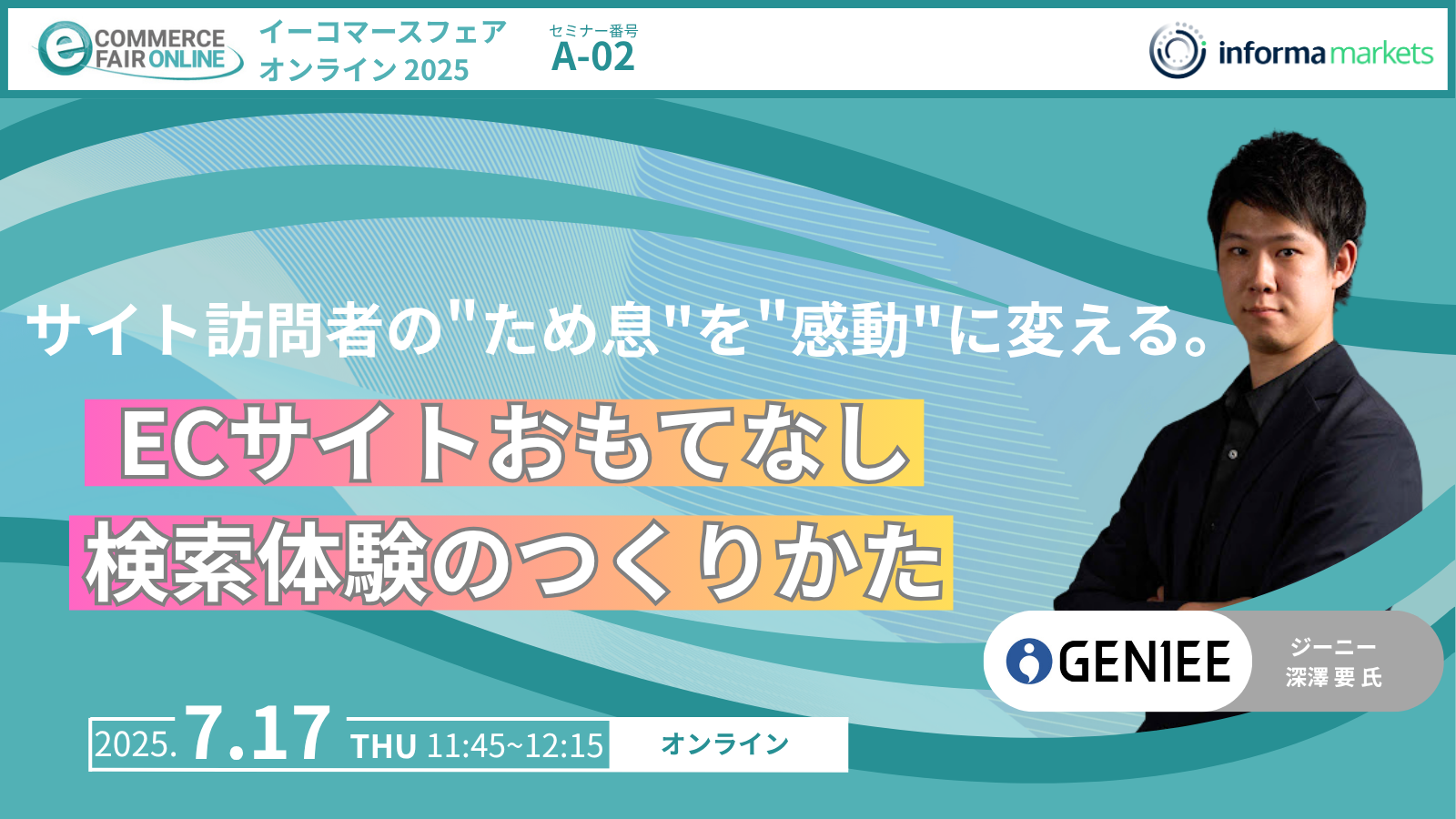 株式会社ジーニー CX事業統括本部 SEARCH事業部は、2025年7月17日(木)に開催されるEC業界に向けたオンラインセミナーイベント「イーコマースフェア オンライン 2025」(主催:インフォーマ マーケッツ ジャパン株式会社)に登壇します。