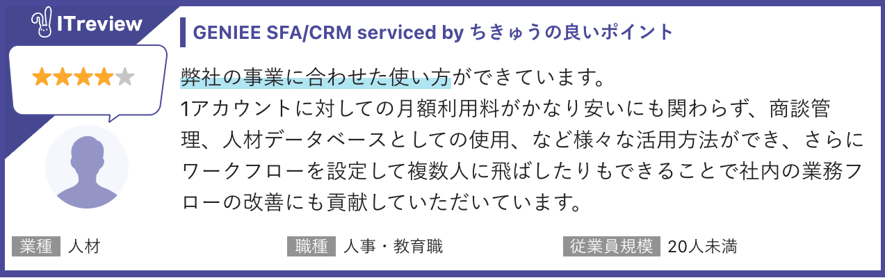 今回の「ITreview Grid Award 2025 Summer」は2025年6月までに掲載されたレビューの集計結果をもとに選定されています。「GENIEE SFA/CRM」を活用した営業進捗の可視化による社内での情報共有や会議の質の改善に関する高評価のコメントが多く寄せられました。