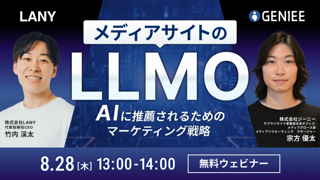 株式会社ジーニー サプライサイド・グローバル事業統括本部は、2025年8月28日(木)に「メディアサイトのLLMO 〜AIに推薦されるためのマーケティング戦略〜」(主催:株式会社LANY、株式会社ジーニー)を開催します。