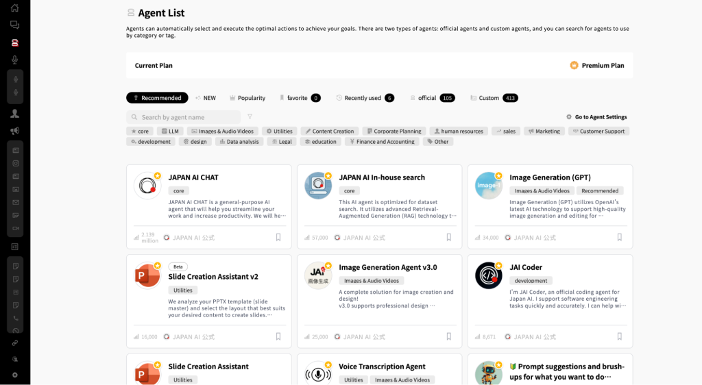 設定画面から言語を英語に切り替えることで、「JAPAN AI CHAT」「JAPAN AI AGENT」「JAPAN AI SPEECH」などの各種サービスが英語で表示できます。