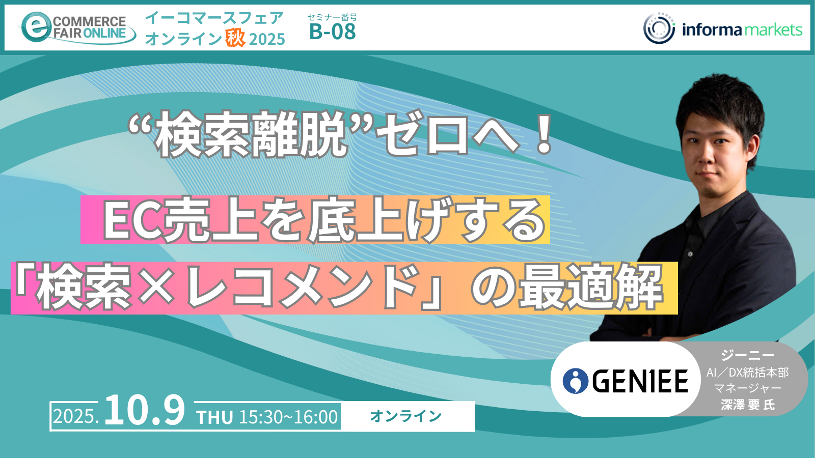 株式会社ジーニー(本社:東京都新宿区、代表取締役社長:工藤 智昭、以下ジーニー)は、2025年10月9日(木)に開催されるオンラインセミナーイベント「イーコマースフェア オンライン 秋 2025」(主催:インフォーマ マーケッツ ジャパン株式会社)に登壇します。