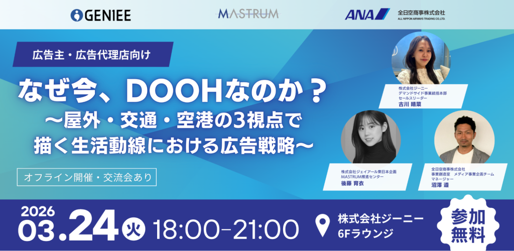 株式会社ジーニー(本社:東京都新宿区、代表取締役社長:工藤 智昭、以下ジーニー)は、2026年3月24日(火)に「なぜ今、DOOHなのか?〜屋外・交通・空港の3視点で描く生活動線における広告戦略」を開催します。